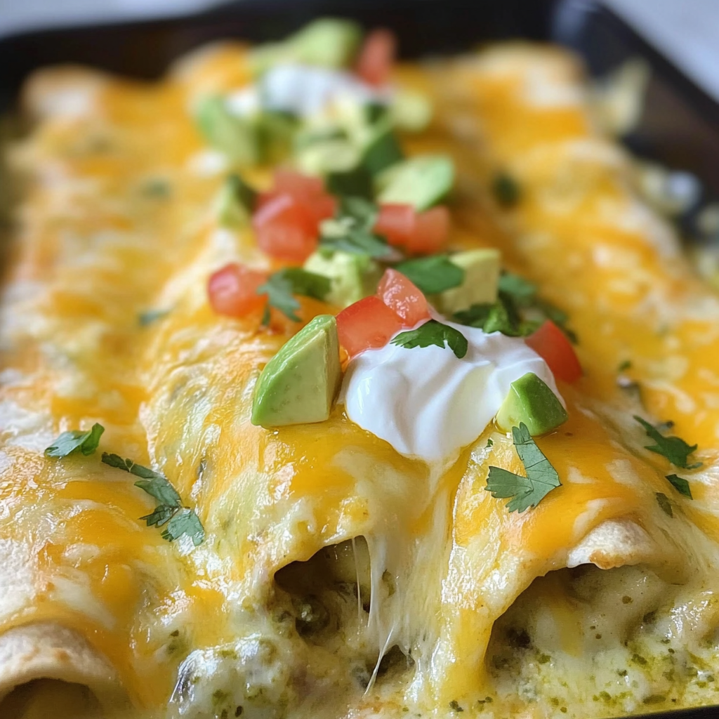 Green Chili Chicken Enchiladas are a rich, comforting Mexican-inspired dish packed with tender chicken, creamy cheese, and flavorful green chilis. Soft flour tortillas are filled with a creamy chicken mixture, rolled, and baked in a savory enchilada sauce before being topped with melted cheddar cheese. The result is a warm, cheesy, and satisfying meal that’s perfect for family dinners, gatherings, or weeknight comfort food. Finished with fresh toppings like sour cream, salsa, tomatoes, and avocado, these enchiladas deliver the perfect balance of creamy, spicy, and fresh flavors.
