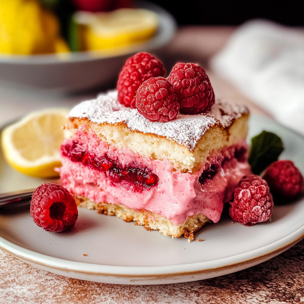 4. Chill and Serve: Refrigerate for at least 4 hours before serving, garnishing with fresh raspberries and lemon slices.