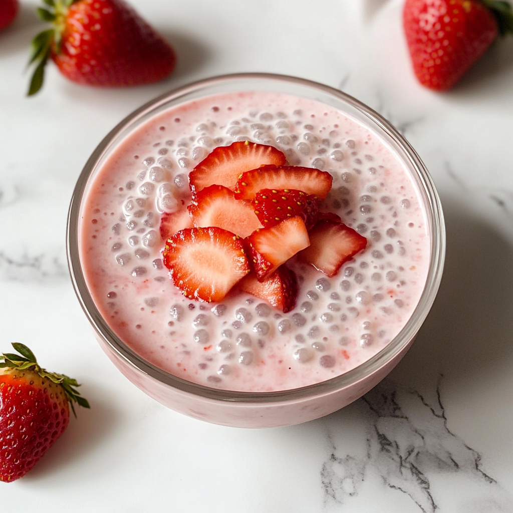Serve in individual-sized cups and garnish with fresh strawberry pieces. Enjoy your delightful strawberry sago!